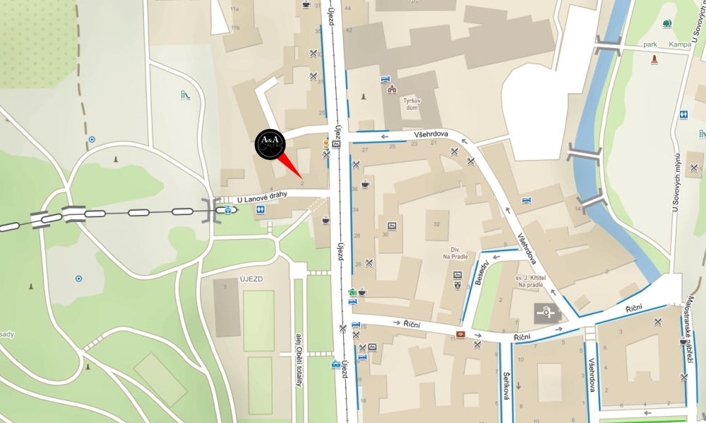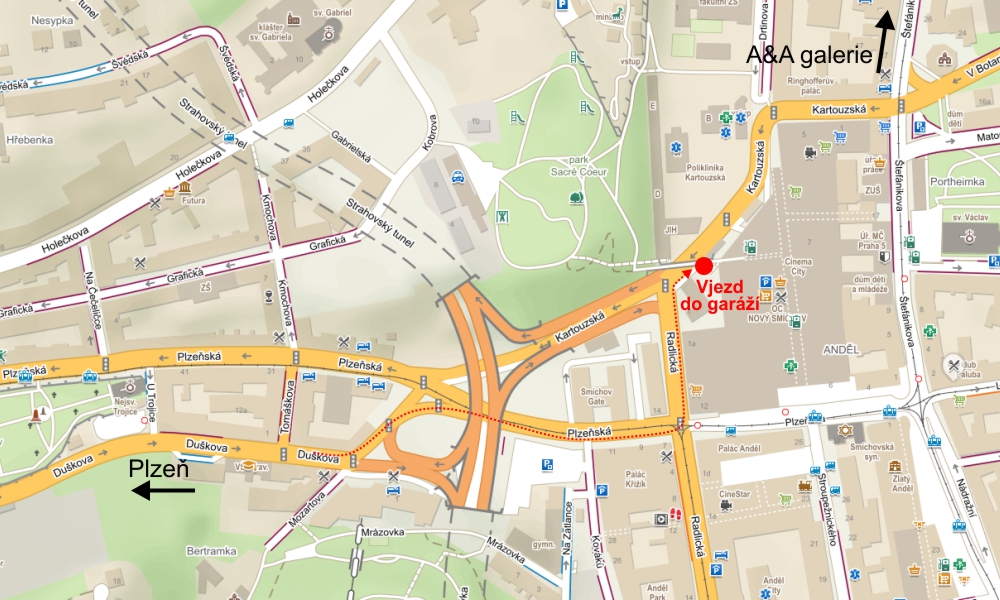 Na doporučení je možné parkovat v ul. Holečkova (je vidět na mapce), nám Kinských a blízké nábřeží.